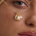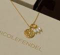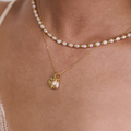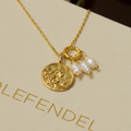 A meaningful talisman necklace featuring a textured coin pendant with blooming stem and star details, finished with a delicate freshwater pearl cluster charm symbolising growth, guidance and new beginnings.